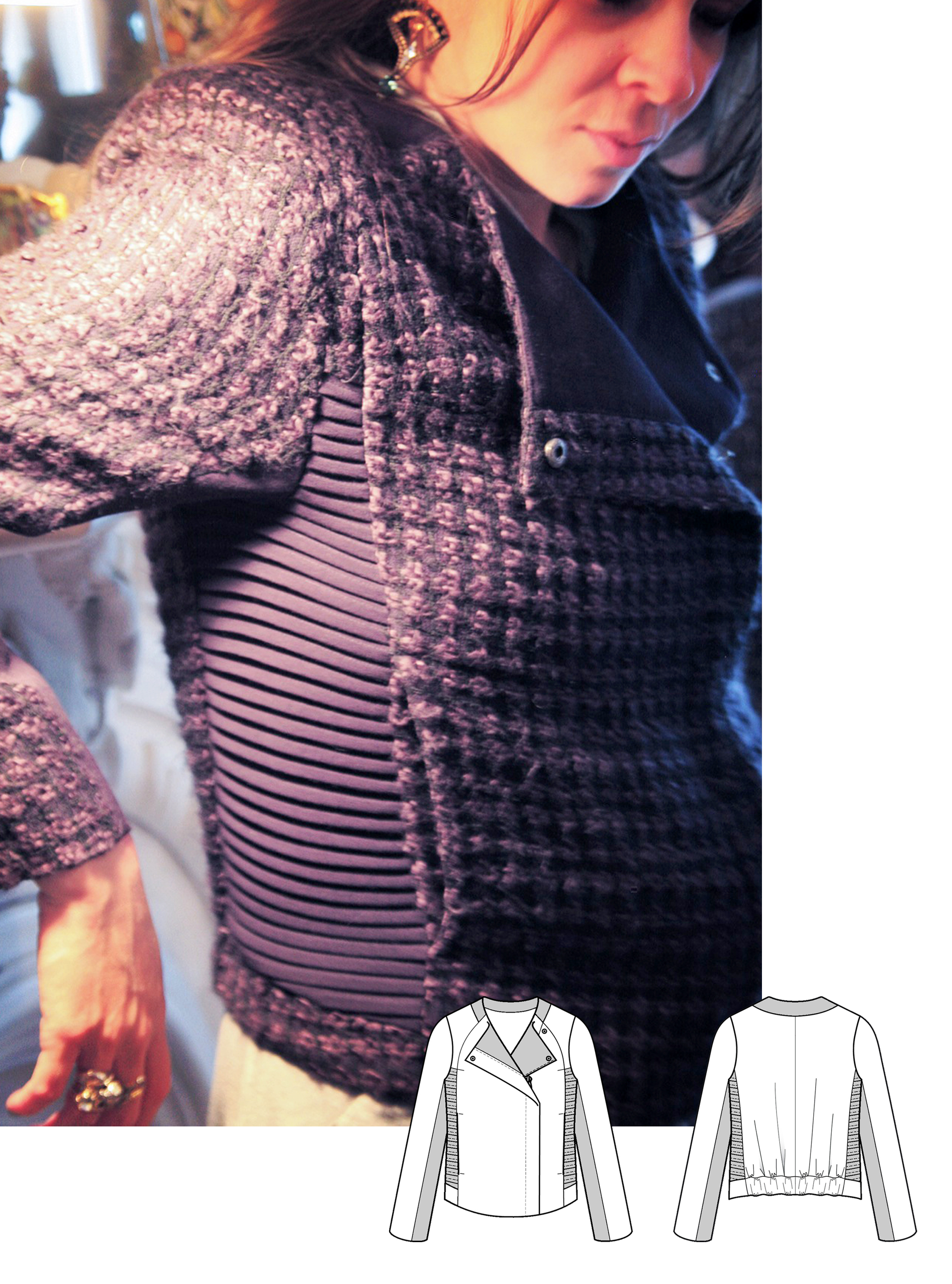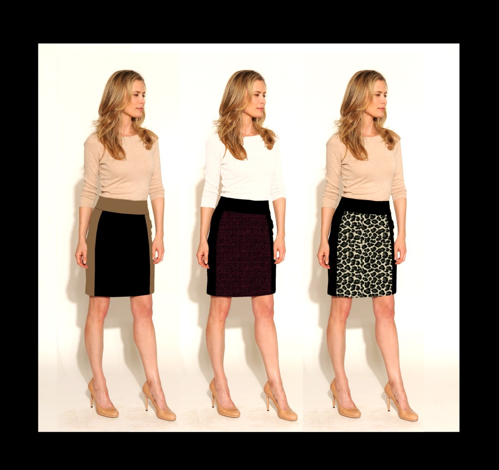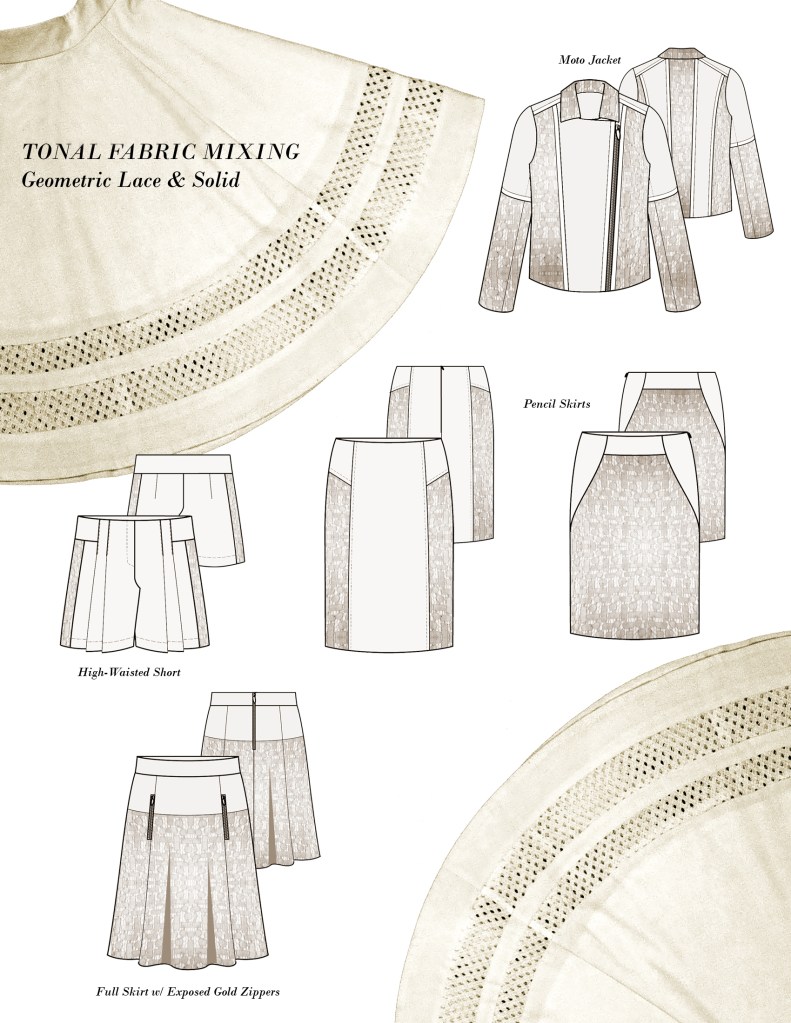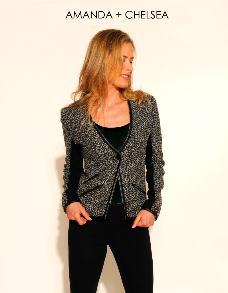 As the workplace dress-code has become increasingly casual, outfitting the modern career woman has proven to be a unique challenge. The solution has been to combine classic silhouettes with key trends, quality fabrics, and a contemporary fit. This “mix-and-match” approach to career dressing offers a variety of narrow leg pants in washable stretch fabrics, novelty skirts in Boucle, Highland Plaids, and Ombre, as well as jackets that range from simple blazers to Motorcycle Silhouettes that utilize Fabric Mixing. Other trends that Rabin has incorporated into the Amanda + Chelsea line include Tonal Jacquards, Lazercutting, Exposed Zippers, Full-Skirts, Color-Blocking, Asymmetry, Printed Ponte, Patterned Faux-Suede, Soft Structure, and Peek-a-Boo Sheer Inserts.